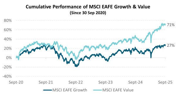 Every wardrobe has a classic piece that keeps coming back. In markets, that role belongs to value. After years of underperformance, value has re-emerged. This resurgence has been strongest outside the US, where lower valuations and cyclical exposures provided the right conditions. In the last five years, value has outperformed growth across Europe, Australasia and the Far East (EAFE).