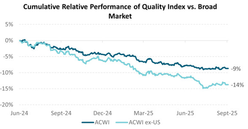 Source: Harbour Asset Management, Bloomberg. Chart shows the relative performance of MSCI ACWI Quality vs. MSCI ACWI, and MSCI ACWI ex-US Quality vs. MSCI ACWI ex-US.