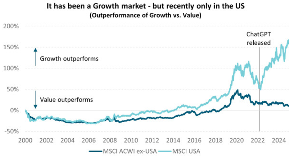 But since the launch of ChatGPT in late 2022, the AI boom has driven a marked divergence, with US growth surging ahead (light blue line trending upwards) while other regions have rotated back toward value (dark blue line trending downwards).